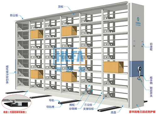 密集架按結構分類有兩種形式,半封閉式密集架和全封閉式密集架,海發HF-MJFB051號密集架就是全封閉式密集架。全封閉式密集架主體由立柱、層板、頂板、底板、節間側板、節與節之前的封板和最外側護板、列門板等組成,比半封閉式密集架多了私密性,因此主要用于存放私密性較強或較小物品的存儲。